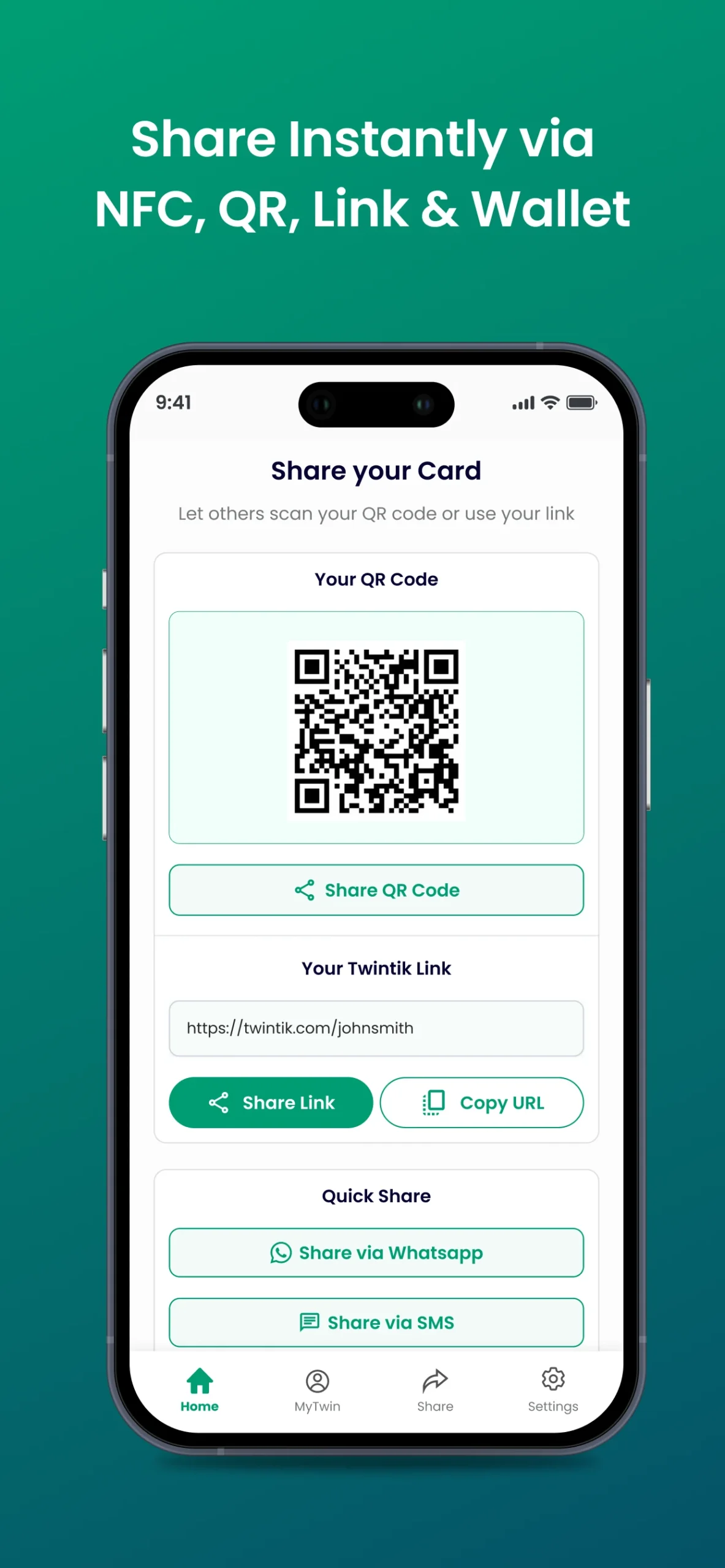 Instant Connectivity: Unified sharing via WhatsApp, LinkedIn, and custom links for frictionless networking.